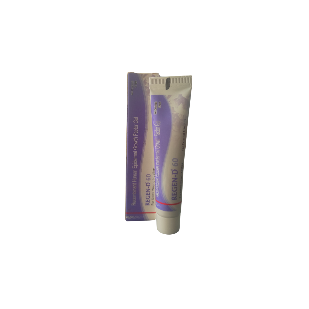 Regen-D 60 Gel is a special skin gel that helps heal wounds and repair damaged skin faster. It contains a human Epidermal Growth Factor (EGF) that supports new skin cell growth. It is mostly used for treating diabetic foot ulcers and chronic wounds.