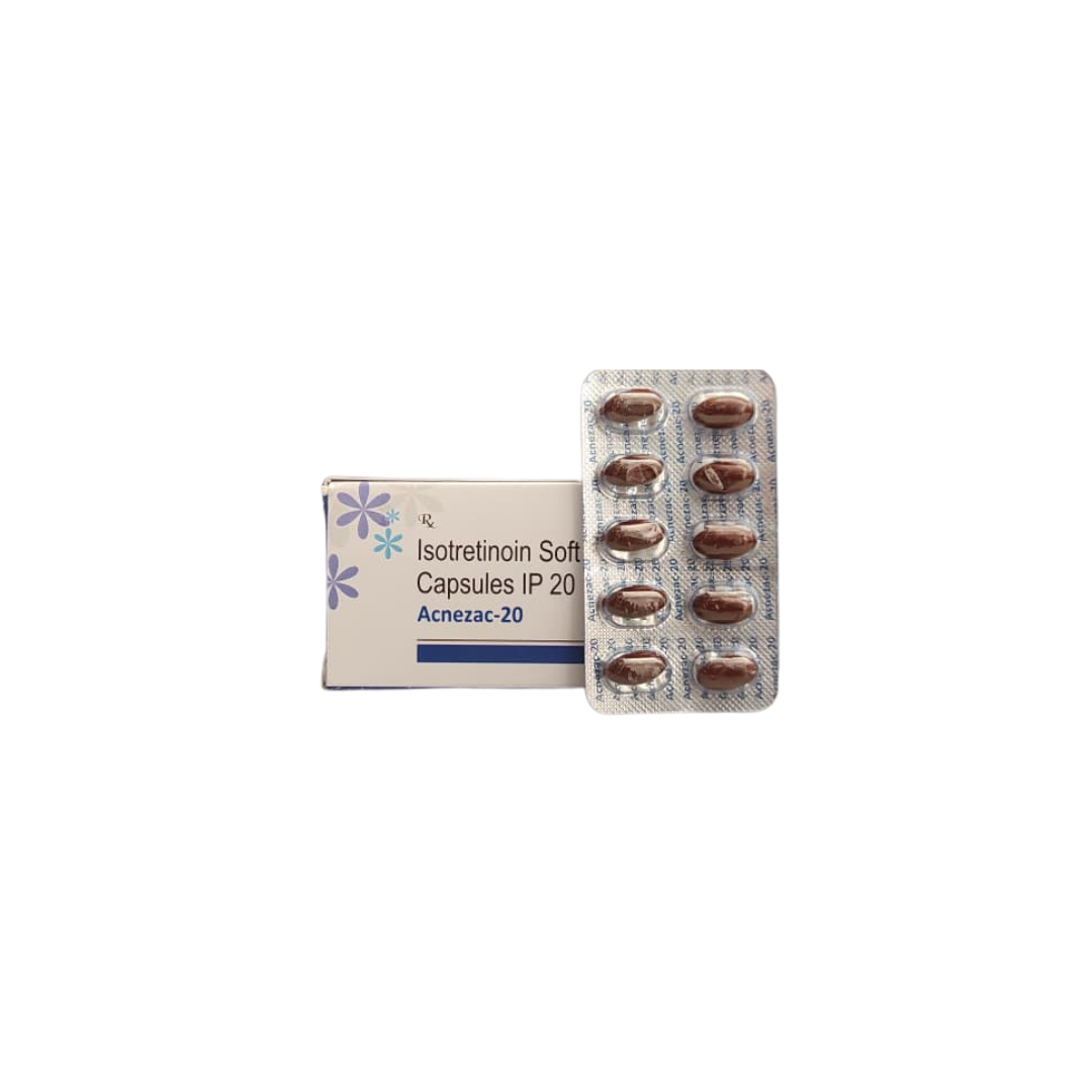 Acnezac-20mg Capsules are used to treat severe acne that does not get better with other creams or medicines. It reduces oil production in the skin, clears pimples, and helps prevent new breakouts. This medicine is taken only under a doctor’s supervision.