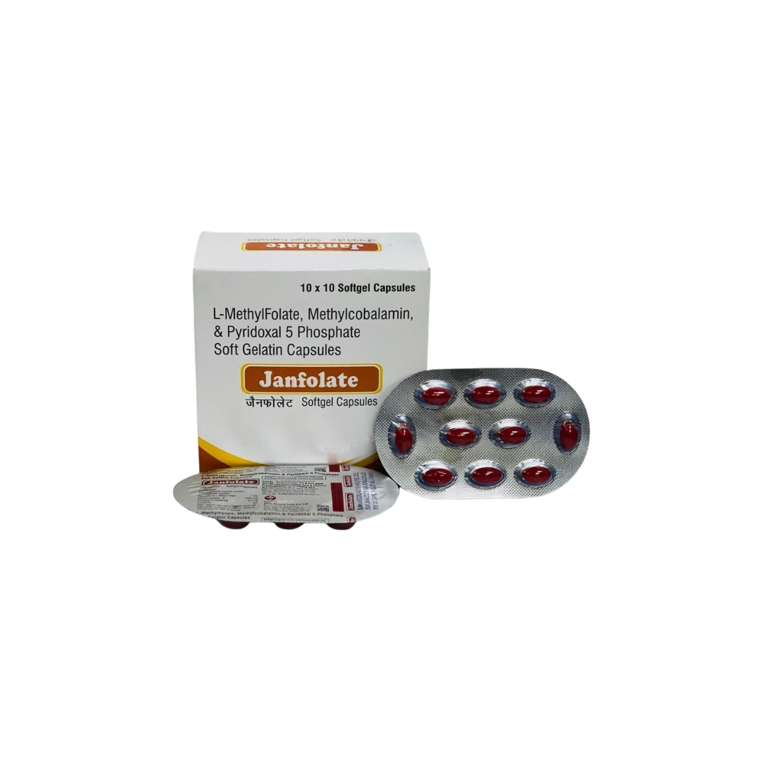 Janfolate Softgel capsules contain three important vitamins: L-Methyl Folate (a form of folic acid), Methylcobalamin (a form of Vitamin B12), and Pyridoxal 5-Phosphate (an active form of Vitamin B6). These vitamins help support your body’s nerve health, brain function, and blood formation.
