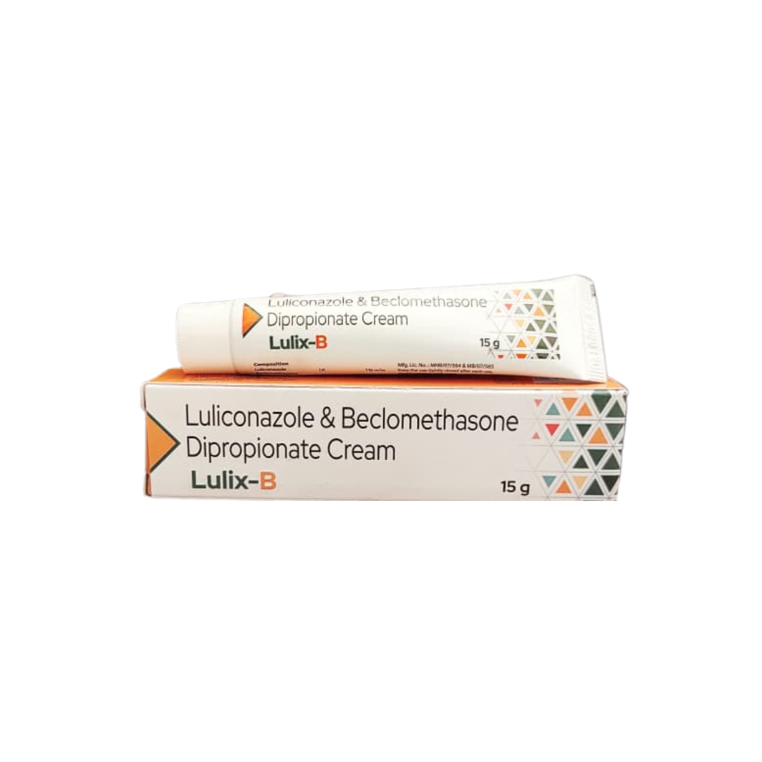 Lulix-B Cream combines luliconazole, an antifungal, with beclomethasone dipropionate, a mild steroid. It is used to treat fungal skin infections with inflammation, redness, and itching. The antifungal fights the infection, while the steroid reduces swelling and irritation.